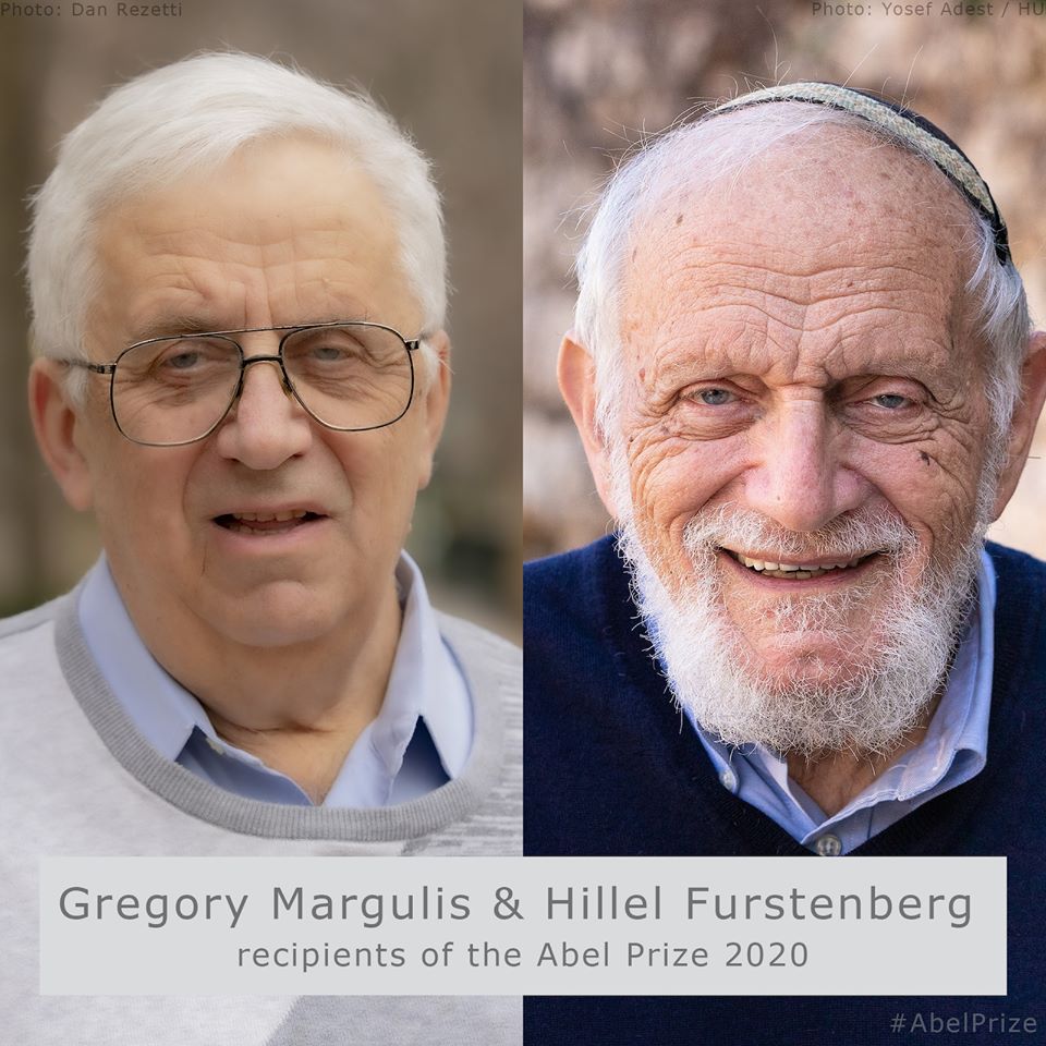 The Norwegian Academy of Science and Letters has decided to award the Abel Prize for 2020 to Hillel Furstenberg from Hebrew University of Jerusalem, Israel, and Gregory Margulis from Yale University, New Haven, CT, USA “for pioneering the use of methods from probability and dynamics in group theory, number theory and combinatorics.”