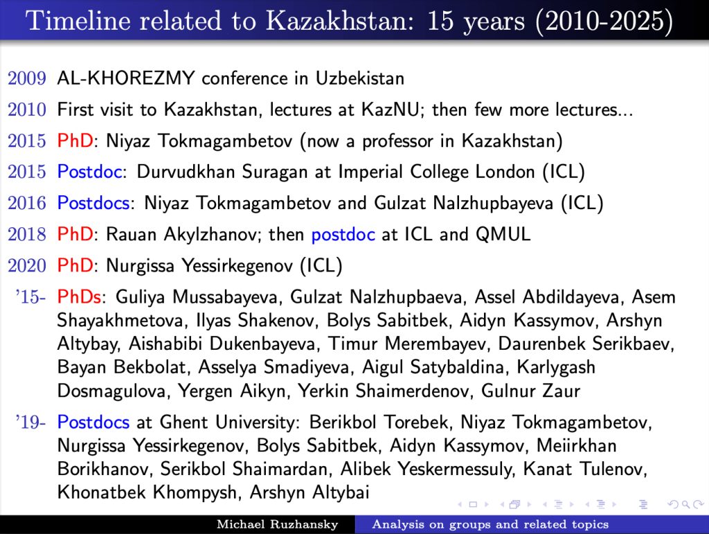 Prof. Ruzhansky shared the story of a remarkable 15-year journey (2010–2025) of academic collaboration with Kazakhstan. Starting from his first lectures at KazNU in 2010, this partnership has grown to include joint research, PhD supervision, and postdoctoral mentorship for many young Kazakhstani scholars.